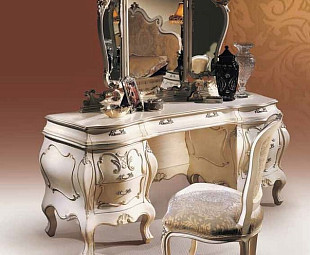 Столик туалетный из массива белый Marco Polo представляет собой грациозный и изящный предмет интерьера. Резные тонкие ножки декорированные сусальным серебром, два выдвижных ящика для хранения мелких принадлежностей. Роскошный дизайн в классическом стиле.