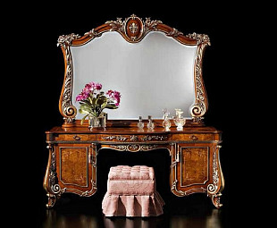Туалетный столик является средоточием красоты и женственности. Фасад богато украшен ручной резьбой с цветочным орнаментом. Изящные круглые ручки ящиков выполнены из состаренного латунного сплава. Столешница украшена прекрасной интарсией из деревесины палисандра, которое обладает потрясающим запахом розы. Все резные детали декорированны сусальным золотом.