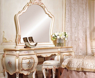 Столик туалетный классический белый Лейла будет незаменимым предметом интерьера. Изготовлен из МДФ белоснежного оттенка, фасады глянцевые, украшены декоративной росписью с цветами, декорирована объемными вензелями из ППУ с цветочными мотивами и покрытыми позолотой.