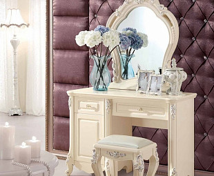 Туалетный столик - предмет обстановки, без которого не обойтись. Классическая модель из коллекции Виктория может стать для вашей комнаты отличным вариантом. Теплый цвет слоновой кости с патиной создает ощущение уюта, света и нежности. Искусная резьба ручной работы выглядит очень красиво. В ящиках и боковом шкафчике разместятся все необходимые принадлежности, а на столешнице - милые сердцу безделушки. Изготовлено из качественных материалов - массива и МДФ. В комплект входит зеркало в декорированной оправе фигурной формы.