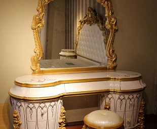 Обрамление зеркала исполнено с резьбой и покрыто позолотой, столешница светлых оттенков из МДФ с глянцевым покрытием. На фасадах выполнен декоративный рисунок, а ножки изогнутые, резные и также с золочением. Внутри расположены 4 выдвижных ящика для личных вещей.