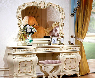 Изготовлен из МДФ в цвете "Слоновая кость", фасады лакированные, сверху расположено декоративное большое зеркало в раме из ППУ с элементами цветочного орнамента. Имеет по 4 выдвижных ящика с каждой стороны и 1 посередине. Дополнительно декорирован позолоченной росписью и резьбой.