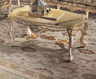 Невероятно красивый журнальный столик от знаменитой итальянской фабрики элитной мебели. Мраморная столешница прямоугольной формы имеет плавные линии и скругленные углы. Объемная и богатая ручная резьба украшает царги и ножки. Сверху нанесено декоративное покрытие из сусального золота, придавая изысканный и шикарный внешний вид. Только ценные породы дерева и всегда высокое качество. Материалы и декор могут быть подобраны индивидуально.
