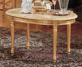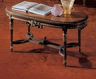 Невероятной красоты журнальный столик в классическом стиле станет приятным дополнением к общему интерьеру Вашей роскошной гостиной. Столешница имеет овальную форму и может быть выполнена как из массива дерева, так и из настоящего мрамора. Ножки в виде конуса имеют балюстрадную форму с прямыми канавками и скреплены внизу изящной витой конструкцией. По всей поверхности царги идет резьба ручной работы в виде растительного орнамента с золотым покрытием. Вся модель сделана из ценных пород древесины, которая обработана под старину в технике патинирования. Материалы и отделка могу быть выбраны Покупателем индивидуально.