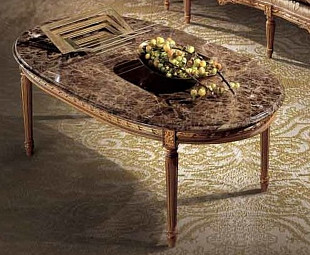 Невероятной красоты журнальный столик овальной формы создан в классическом стиле по мотивам салонов Людовика XVI для дорогих, солидных интерьеров. На него так удобно положить журнал или поставить вазу с фруктами. Мраморная столешница, как и любой натуральный камень, имеет свой неповторимый рисунок, делая данную модель поистине уникальной и дорогостоящей. Царги и ножки украшены резьбой ручной работы с эффектом патинирования и нанесением декоративного покрытия из сусального золота. Ваша гостиная будет просто сиять! Материал и отделка могут быть подобраны индивидуально.