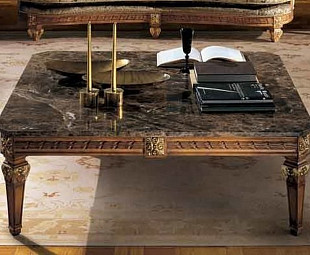 Дорогой журнальный столик в классическом стиле для роскошных гостиных Премиум-класса. Массивная, квадратная форма из ценных пород дерева. Столешница с чуть скошенными углами сделана из натурального мрамора темно-коричневого цвета с белыми вкраплениями, рисунок которого, как любого природного материала, уникален и неповторим. Ножки очень устойчивы и вырезаны в виде пирамиды. Царги украшены объемными цветами ручной работы и покрыты сусальным золотом с патиной для придания особого шика и винтажности. Ткани и отделка могут быть выбраны индивидуально.