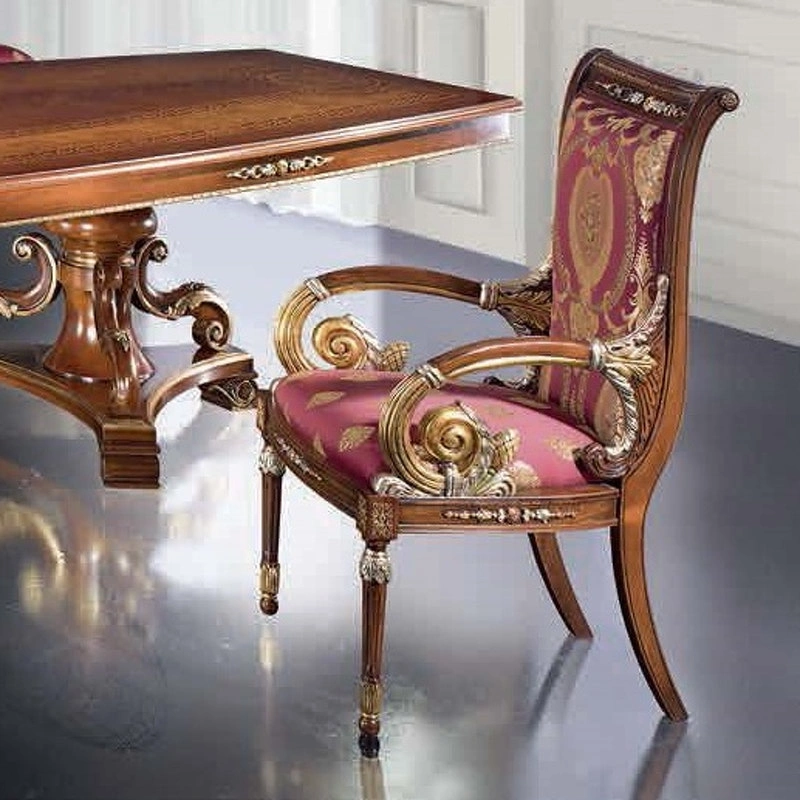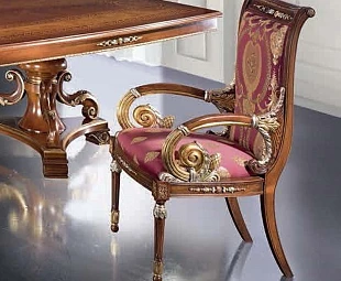 Стул на фигурных ножках выполнен в классическом стиле. Спинка и сиденье обтянуты тканью. Загнутые подлокотники и резные детали подчеркивают оригинальность модели.