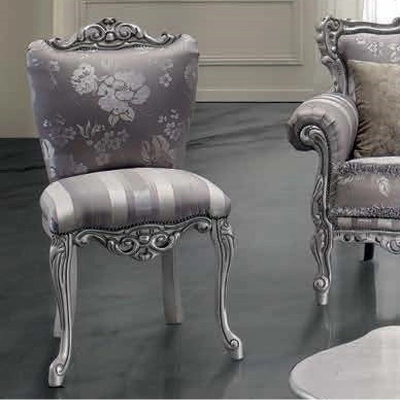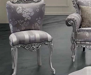 Стул на изогнутых ножках выполнен в классическом стиле. Фигурная спинка и основание декорированы резьбой. Сиденье и спинка обтянуты тканью.