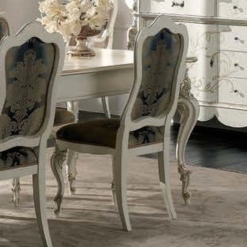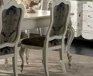 Стул на изогнутых ножках выполнен в классическом стиле. Фигурная спинка и сиденье обтянуты тканью. Декорирован резьбой.
