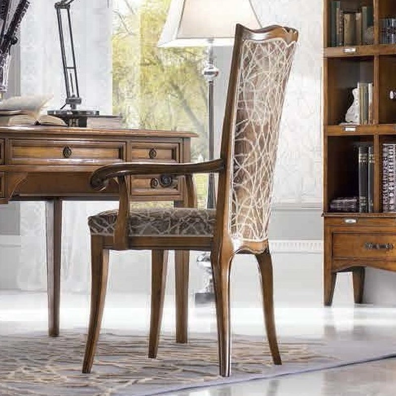 Стул на изогнутых ножках выполнен в классическом стиле. Спинка и сиденье обтянуты тканью. Загнутые подлокотники и фигурная спинка подчеркивают оригинальность модели.