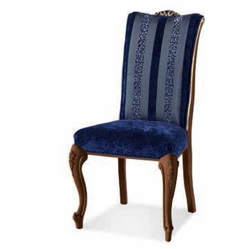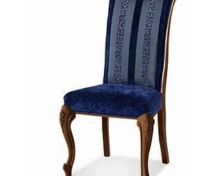 Стул на изогнутых резных ножках выполнен в классическом стиле. Сиденье и спинка обтянуты тканью.