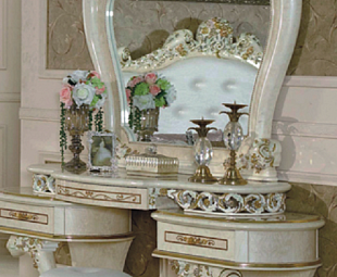 Светлый туалетный столик коллекции Принцесса элегантный и стильный. Детали декора создают гармоничный ансамбль дизайна и делают приятным время проведенное за ним. Конструкция туалетного столика сделана таким образом, чтобы создать максимальное удобство при пользовании. Крышка стола не закрывает тумбочки полностью и оставляет место по бокам, которое можно использовать под баночки с кремом и другие предметы для макияжа.
