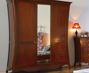 Трехдверный шкаф Capri. Дизайн шкафа выполнен в классическом стиле, но адоптирован к современному образу жизни. Шкаф напоминает настоящее произведение искусства в области мебели. Вся мебель коллекции Capri сделана из высококачественного массива дерева и дополнена шпоном. В обработке мебели используются специальные методы, которые придают ей исторический характер. Шкаф выполнен в цвете черешня патинированная. Элементы ручной работы, украшающие шкаф, являются результатом работы профессиональных дизайнеров и мастеров. По этой причине, каждый элемент шкафа является уникальным, что дает ощущение будто бы мебель выполнена по вашему индивидуальному заказу. Шкаф коллекции Capri наполнит атмосферу вашего дома изысканностью, элегантностью и принадлежностью сразу к нескольким эпохам.