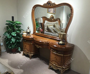 Изготовлен из МДФ орехового оттенка, столешница расположена на двух тумбах с тремя выдвижными ящиками каждая, фасады глянцевые, украшены витым рисунком с золочением. Дополнительно декорирован объемными резными элементами, покрытыми позолотой из ППУ. Зеркальное оформление выглядит роскошно и дополнено короной посередине.