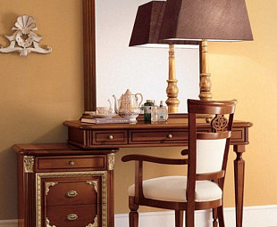 Туалетный столик с тумбой Capri фабрики San Michele. Столик выполнен в классическом стиле, лучшими итальянскими мастерами и дизайнерами. Столик сделан из высококачественного массива и шпона вишни в цвете вишня. Украшен столик элементами из сусального золота. Столик имеет тумбу с тремя ящиками.