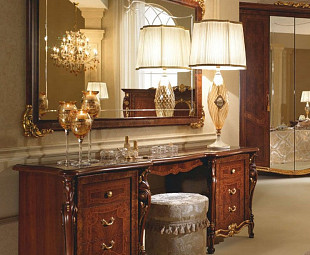 Туалетный столик с ящиками Donatello от мебельного концерна Arredo Classic сделан из деревянного массива и тамбурата. Объемная и вместительная модель с шестью выдвижными ящиками, украшена резными позолоченными элементами и декоративными накладками. На поверхности фасадов нанесен красивый рисунок. Дополнительно комплектуется большим настенным зеркалом и пуфом.