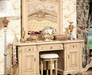 Туалетный столик Лаура. Классический туалетный столик сделан из высококачественного мдф в отделке цвета слоновая кость, с текстурой дерева. Столик имеет три выдвижных ящика и две дверцы для хранения, дополняет стол большое классическое зеркало. Ящики оснащены металлическими механизмами выдвижения. Украшают столик декоративные элементы. Роскошный столик дополнит интерьер вашей спальни