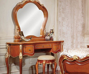 Изготовлен из МДФ в цвете "Орех", зеркальная часть обрамлена роскошной рамой из ППУ с позолотой. Фасады глянцевые, декорированы резьбой, имеет три выдвижных ящика.
