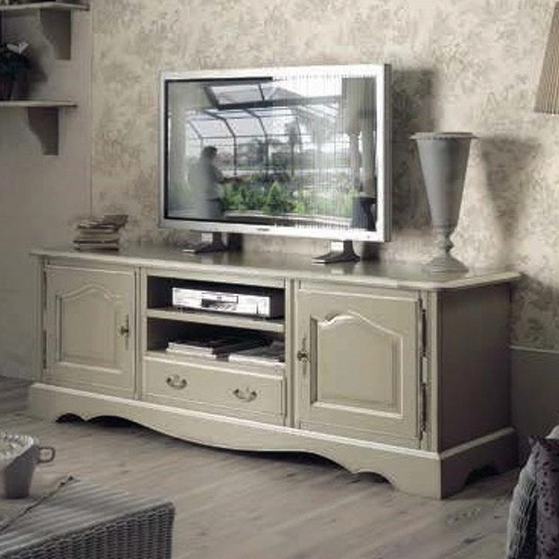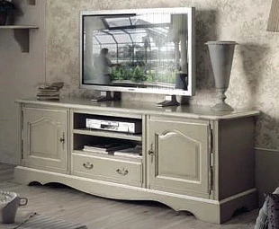 Тумба под TV выполнена в классическом стиле. Оснащена открытыми полками, ящиком и двумя дверцами. Фигурная кромка передней панели подчеркивает оригинальность модели.