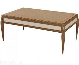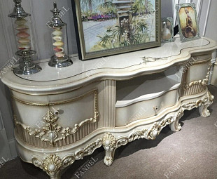 Изготовлена из МДФ белоснежного оттенка, фасады глянцевые, покрыты декоративной росписью и резьбой с золочением, дополнительным декором являются объемные элементы из ППУ с позолотой. Справа и слева расположены скрытые отделения для хранения с распашными дверцами, посередине выдвижной ящик и открытая ниша.
