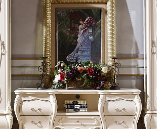 Изготовлена из МДФ, имеет пять выдвижных ящиков и открытую нишу посередине. Фасады белоснежные, глянцевые с декором из ППУ с цветочными мотивами.