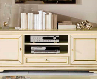 Тумба под телевизор низкая Marco Polo отлично дополняет классический интерьер. Два отделения, скрытых за распашными дверцами, две открытые ниши и выдвижной ящик позволят разместить необходимые вещи. Сливочный оттенок и резной орнамент на фасаде с сусальным золотом привнесут в дизайн роскошь и изящность.