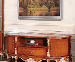 Тумба под телевизор низкая Мирелла станет незаменимой в роскошном классическом интерьере. Изготовлена из МДФ в теплом ореховом оттенке, фасады глянцевые, декорированы росписью и узорным орнаментом из ППУ с позолотой.