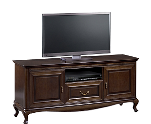 Тумба под телевизор с ящиками Verona Taranko производится польской фабрикой из массива дерева в двух цветах - braz и krem patina. Удачный вариант для обстановки комнаты в классическом стиле. Два боковых отдела, закрытые непрозрачными дверцами, и выдвижной ящик, снабженный мягкими доводчиками, повышают функциональную ценность тумбочки. В верхней части тумба дополнена нишей для DVD-плеера.