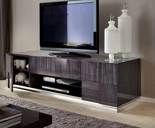 Тумба под телевизор современная Montecarlo своим лаконичным и сдержанным дизайном отлично впишется в гостиную комнату. Две распашных дверцы, выдвижной ящик и открытая ниша для хранения. Отделка шпоном дерева Koto и лакированные поверхности фасадов с хромированной ножкой.