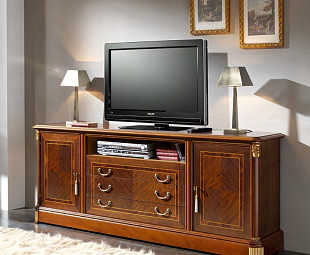 Шпон американского ореха или оливы с инкрустацией из корня вяза, патина золото или серебро, лак.