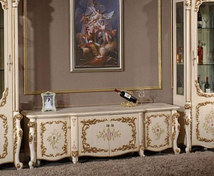 Выполнена из МДФ, фасады глянцевые дополнены цветочным орнаментом и золоченой росписью с резьбой. Четыре отделения с полками скрыты за распашными дверцами. Дополнительный декор из объемных элементов ППУ с позолотой.