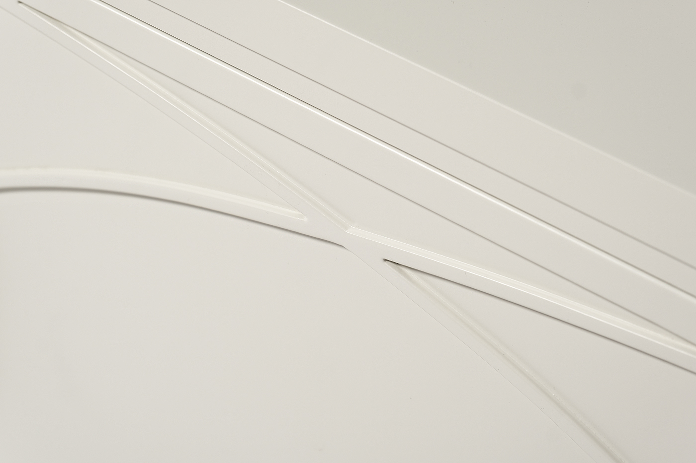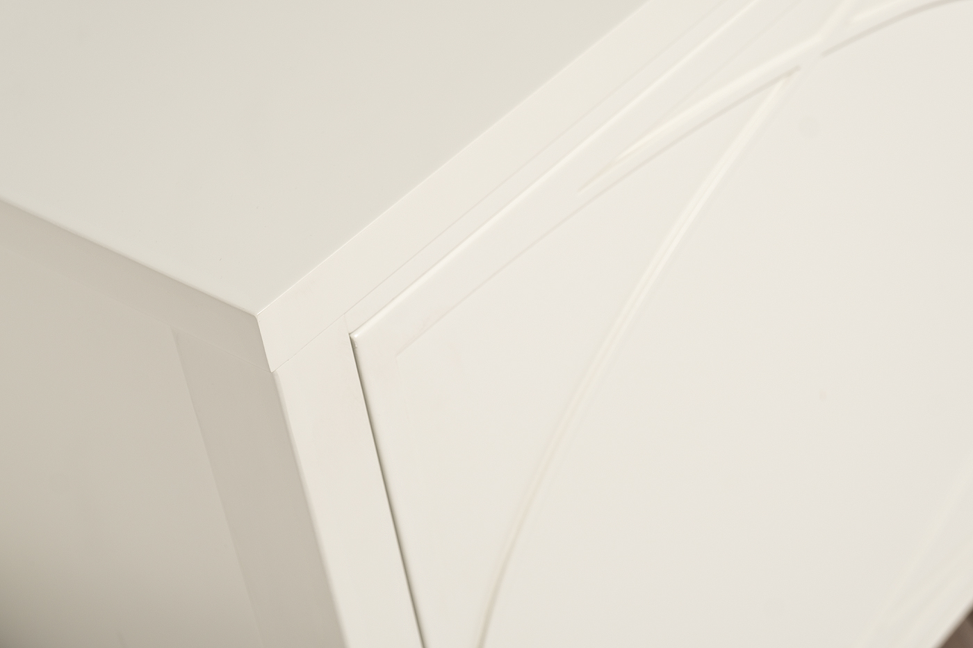 Бежевый матовый фасад украшен объемным дугообразным декором и широкими рельефными ручками золотого цвета (матовое золото).
