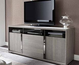 Тумба под ТВ длинная Tivoli гармонично впишется в современный дизайн гостиной. Возможно дополнение задней стенкой из шпона дерева Koto и верхней полкой для деталей интерьера. Также отлично дополняется стеллажами для книг из коллекции. Три отделения, скрытые за распашными дверцами с хромированным декором и одна ниша сверху.