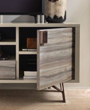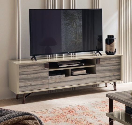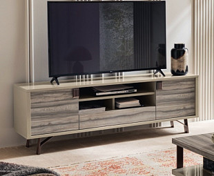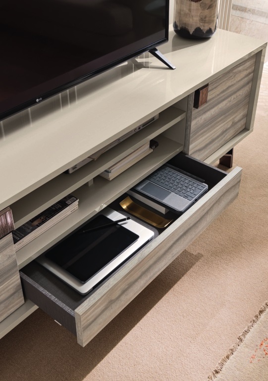В центральной части тумбы две открытые полки и выдвижной ящик.