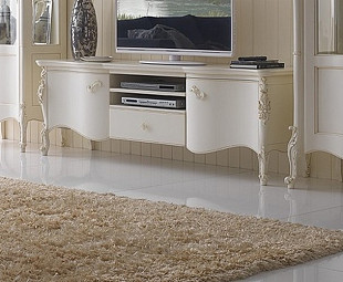 Тумба под ТВ итальянская классика Venere изготовлена из натурального дерева в белом цвете. Обладает уникальным дизайном с обтекаемыми формами и вытянута в длину. Имеет функциональное наполнение и привлекательный фасад с серебряными ручками.