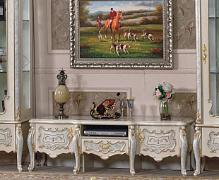 Тумба под ТВ в стиле классика коллекции Королева для гостиной выполнена в светлых тонах. Элегантный дизайн и изящная резьба тумбочки украсят интерьер Вашей комнаты. Тумба имеет три небольших ящика и отрытое отделение под DVD.