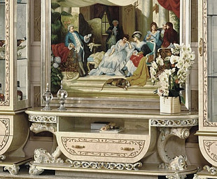 Тумба под ТВ с полками коллекции Принцесса выполнена в цвете слоновая кость. Элегантный оттенок и изящные линии тумбочки украсят роскошную гостиную.