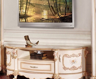 Тумба под ТВ белая классическая Лейла гармонично дополнит интерьер и поможет организовать пространство за счет двух отделений за распашными дверцами, выдвижного ящика посередине и открытой нишей под столешницей.