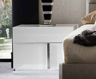 Тумба прикроватная белая в спальню Canova с двумя выдвижными ящиками для удобного хранения вещей рядом с кроватью. Цветовое решение белый глянец с хромированными деталями. Простой и изысканный элемент гарнитура.