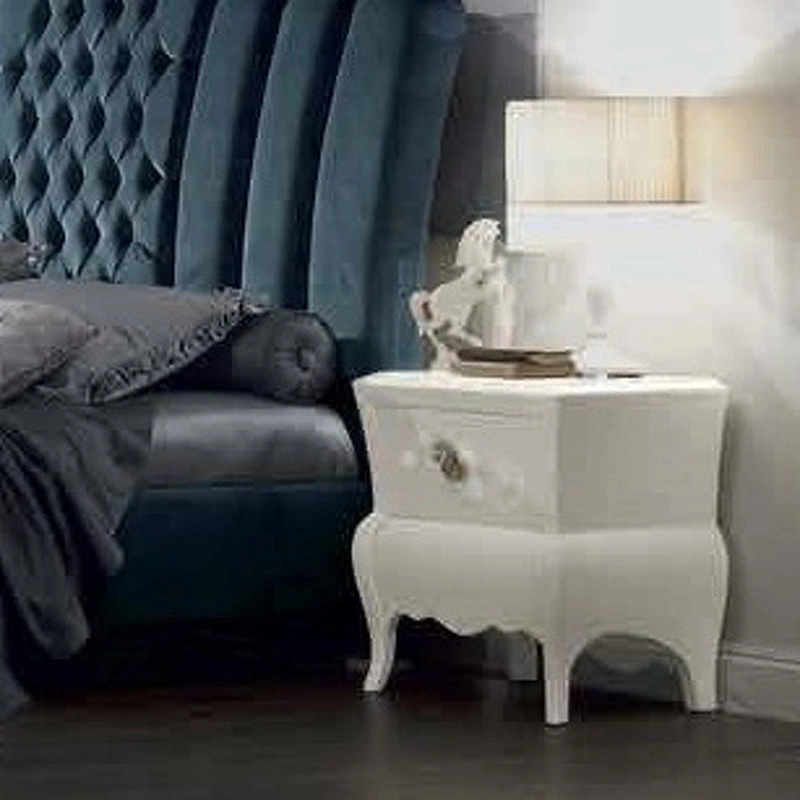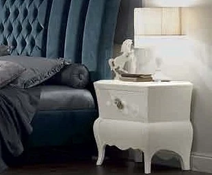 Прикроватная тумбочка на изогнутых ножках выполнена в неоклассическом стиле. Оснащена выдвижным ящиком. Фасад декорирован растительным узором.