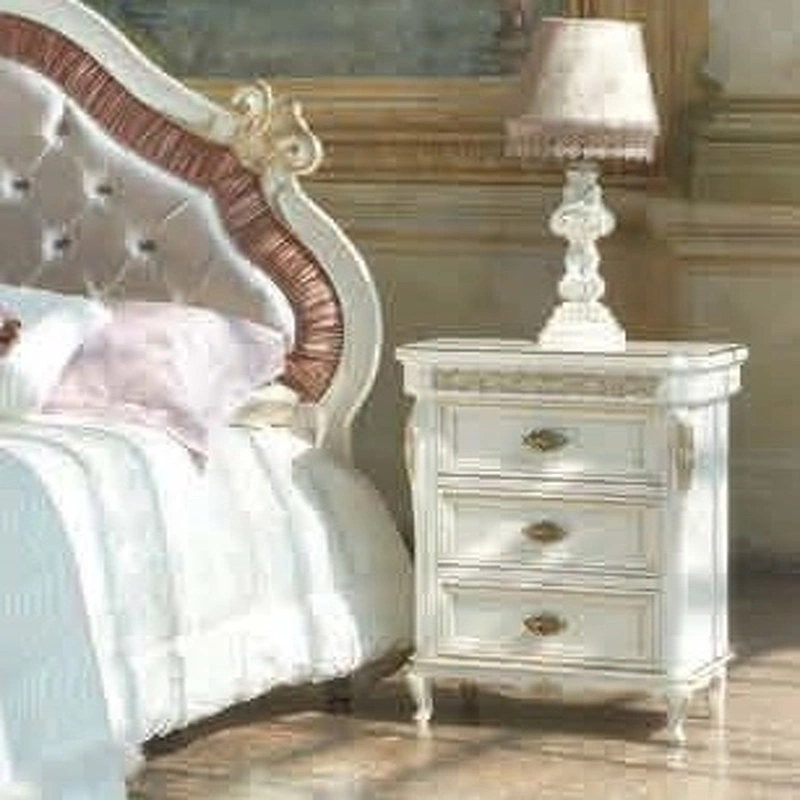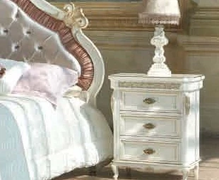 Прикроватная тумбочка на изогнутых ножках выполнена в классическом стиле. Декорирована резьбой. Оснащена тремя выдвижными ящиками.