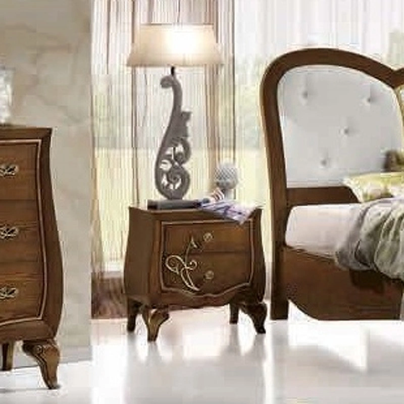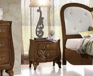 Прикроватная тумбочка на изогнутых резных ножках выполнена в классическом стиле. Оснащена двумя выдвижными ящиками. Фасады декорированы орнаментом.