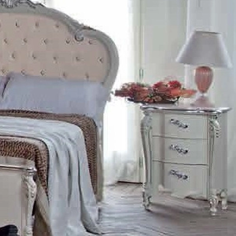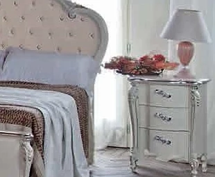 Прикроватная тумбочка на изогнутых ножках выполнена в классическом стиле. Оснащена тремя выдвижными ящиками. Декорирована резьбой.