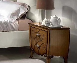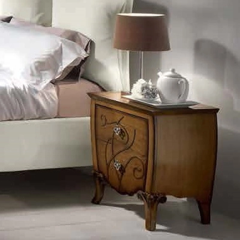 Прикроватная тумбочка на изогнутых ножках выполнена в классическом стиле. Оснащена двумя выдвижными ящиками. Фасады декорированы орнаментом.