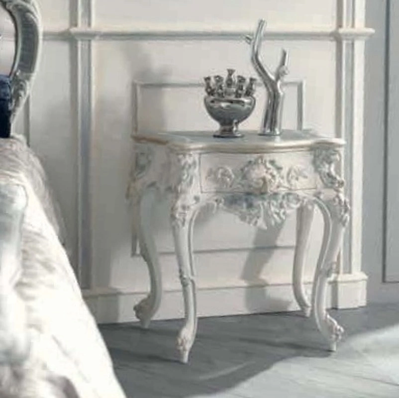 Прикроватная тумбочка на изогнутых ножках выполнена в классическом стиле. Декорирована резьбой. Оснащена одним выдвижным ящиком.