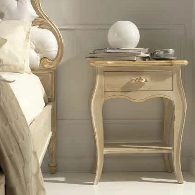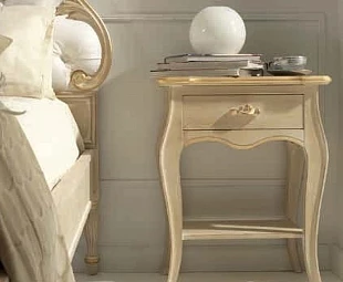 Прикроватная тумбочка на изогнутых ножках выполнена в классическом стиле. Оснащена выдвижным ящиком и открытой полкой. Фигурная ручка подчеркивает оригинальность модели.