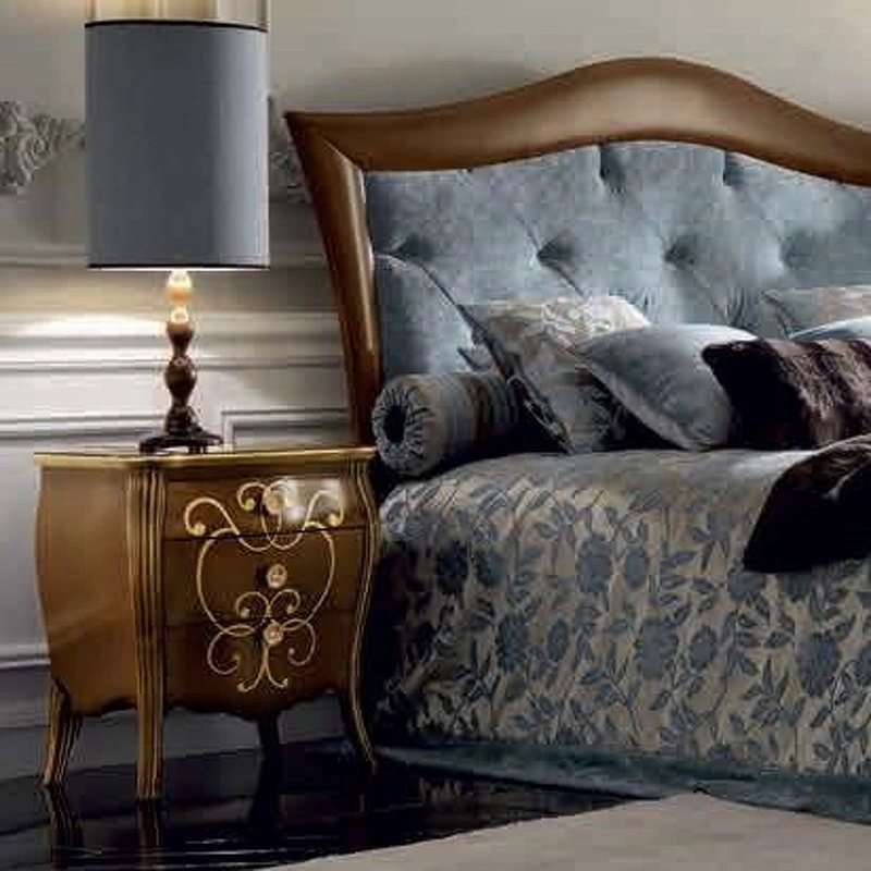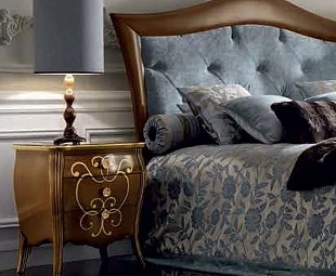 Прикроватная тумбочка на изогнутых резных ножках выполнена в классическом стиле. Оснащена тремя выдвижными ящиками. Фасады декорированы орнаментом.