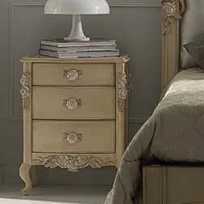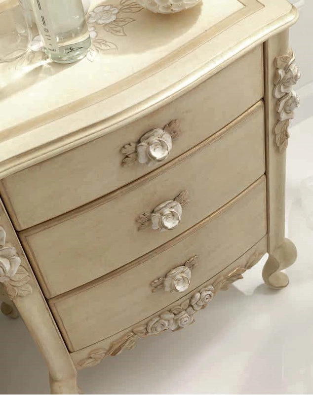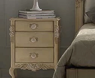 Прикроватная тумбочка на изогнутых ножках выполнена в классическом стиле. Декорирована резьбой. Оснащена тремя выдвижными ящиками.