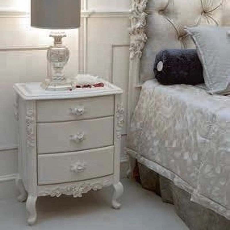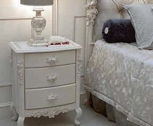 Прикроватная тумбочка на изогнутых ножках выполнена в классическом стиле. Декорирована резьбой. Оснащена тремя выдвижными ящиками.