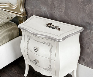 Тумба прикроватная белая из массива Le Muse изготовлена из массива дерева, украшена серебром с легкой патиной, имеет два выдвижных ящика.